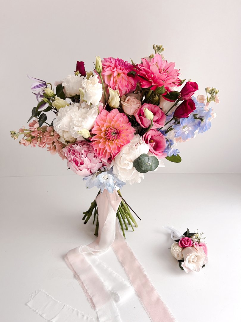 - Svadobná kytica, pierka pre ženícha, svadobných hostí, kvetinové náramky pre družičky