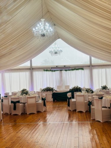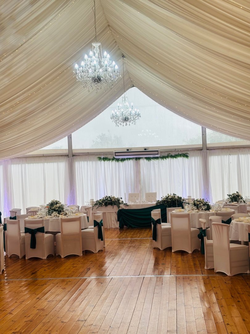 Máme k dispozícii svadobnú sálu s kapacitou 100 hostí a svadobný stan, ktorý sa nachádza na záhrade s kapacitou 170 hostí.